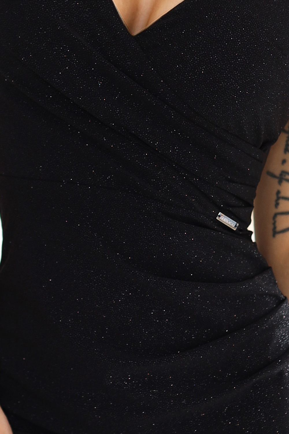 610-1 Olśniewająca brokatowa sukienka ołówkowa z kopertowym dekoltem i ramiączkami - czarna