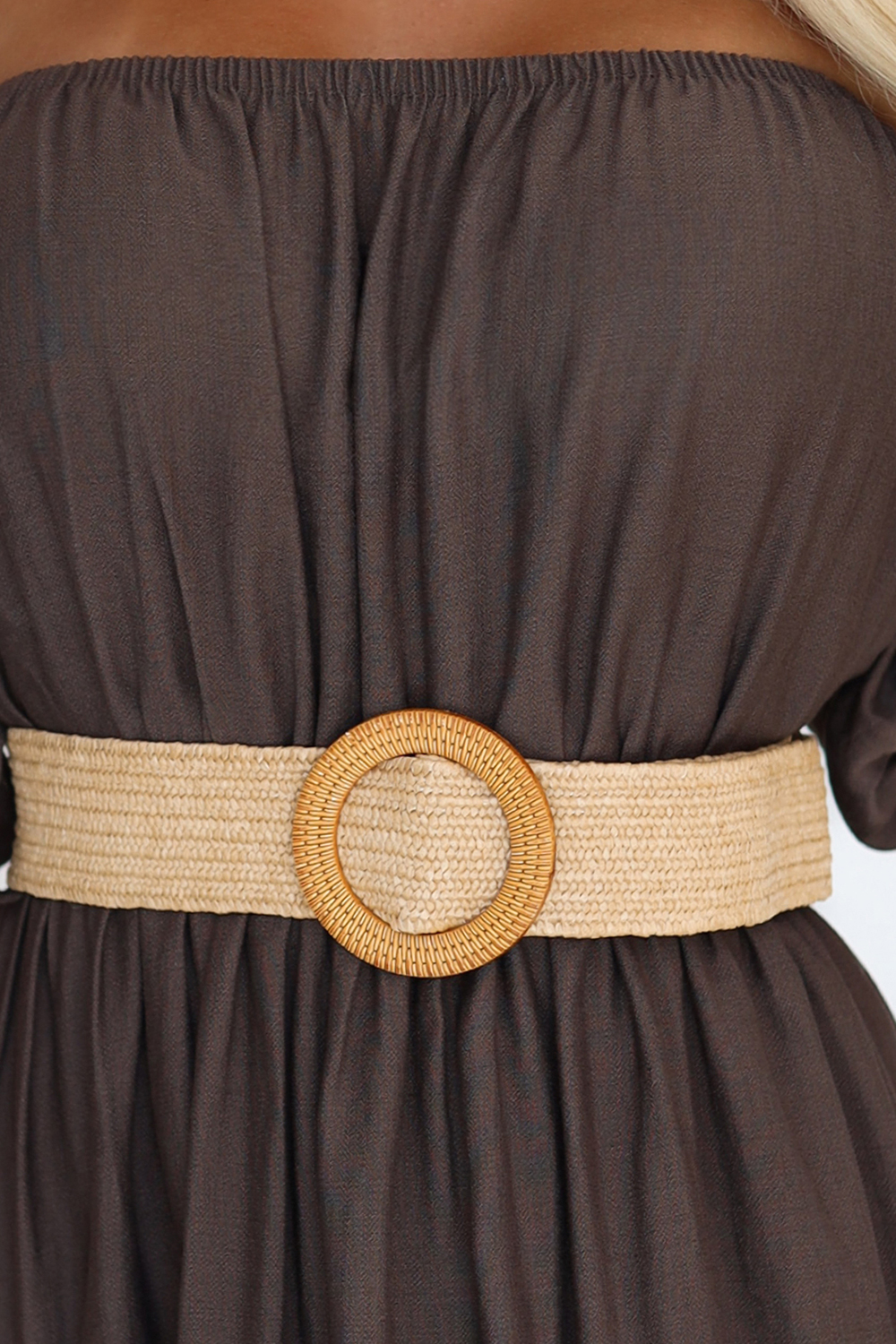 Czekoladowa sukienka maxi boho z odkrytymi ramionami i plecionym paskiem | Numoco basic