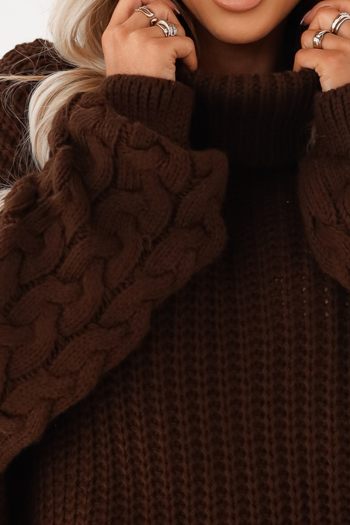 To nie jest zwykły golf. Jego luźny fason typu oversize zapewnia pełną swobodę ruchów i sprawia, że sylwetka wygląda na bardziej zrelaksowaną, a jednocześnie otuloną. Uwagę przyciągają przede wszystkim szerokie rękawy ozdobione grubym splotem warkoczowym. To właśnie ten detal nadaje całości trójwymiarowości i sprawia, że sweter wygląda na produkt klasy premium.