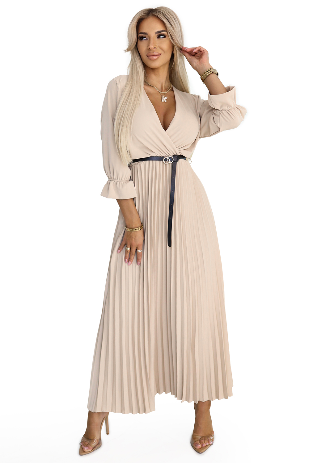 462-5 SERENA Plisowana sukienka maxi z dekoltem, paskiem i rękawem 3/4 - CIEMNY BEŻ Elegancka plisowana sukienka w kolorze ciemnego beżu z kopertowym dekoltem i czarnym paskiem. Idealna na specjalne okazje i na co dzień. Marka Numoco Basic. Produkcja europejska. 462-5 SERENA Plisowana sukienka maxi z dekoltem, paskiem i rękawem 3/4 - CIEMNY BEŻ Elegancka plisowana sukienka w kolorze ciemnego beżu z kopertowym dekoltem i czarnym paskiem. Idealna na specjalne okazje i na co dzień. Marka Numoco Basic. Produkcja europejska.
