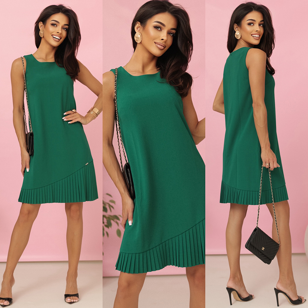 308-4 KARINE elegancka trapezowa sukienka z asymetryczną plisą - ZIELONA