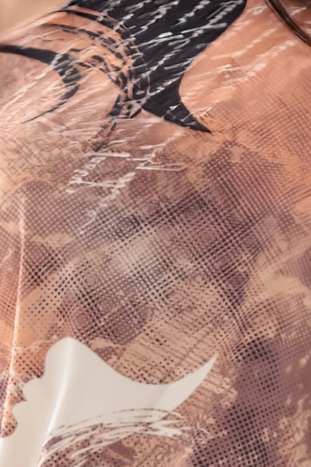 Wzór w odcieniach miedzi, beżu i czerni nadaje stylizacji wyjątkowego charakteru. Dekolt w łódkę można nosić również zmysłowo opuszczony na jedno ramię. Model posiada rękaw 3/4 i praktyczne kieszenie. Idealna zarówno na codzienne spotkania, jak i wieczorne wyjścia.