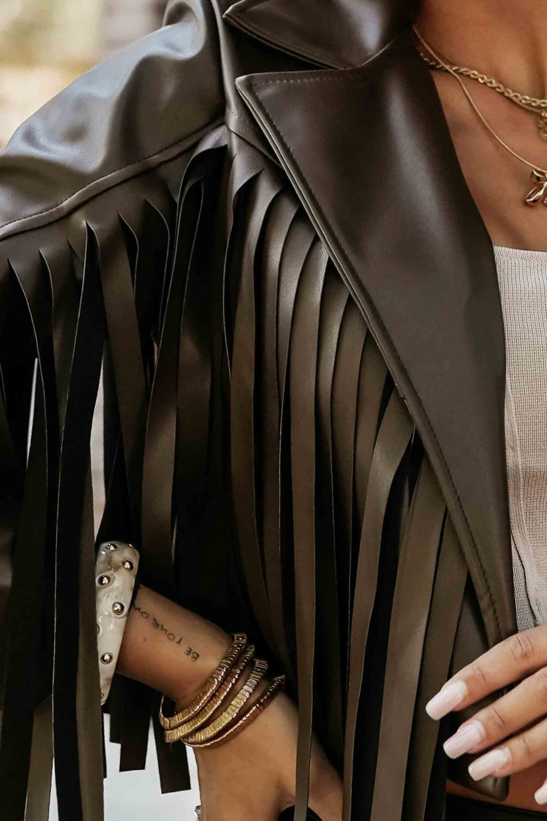 Dynamiczne frędzle dodają ruchu każdej stylizacji, przyciągając spojrzenia i tworząc spektakularny efekt przy każdym kroku. Ramoneska doskonale sprawdzi się zarówno w miejskich zestawach z jeansami, jak i w bardziej odważnych stylizacjach z sukienką lub skórzanymi spodniami. To must have na sezon przejściowy – stylowy, lekki i niezwykle wygodny.